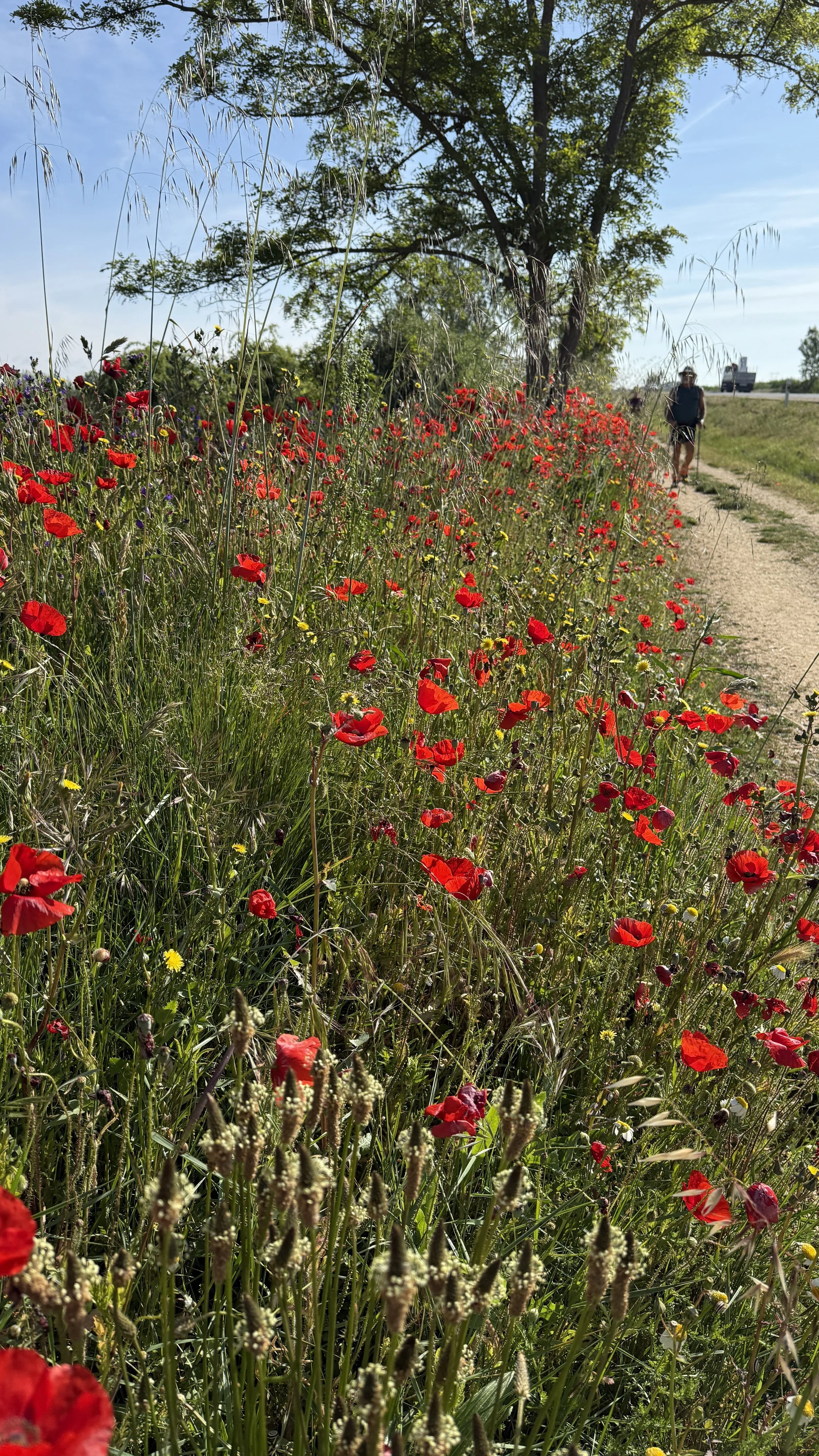 The path has flattened out and now hugs a major highway—hot, exposed, head-down work except for the pretty wild flowers. Just tick the kilometers off.