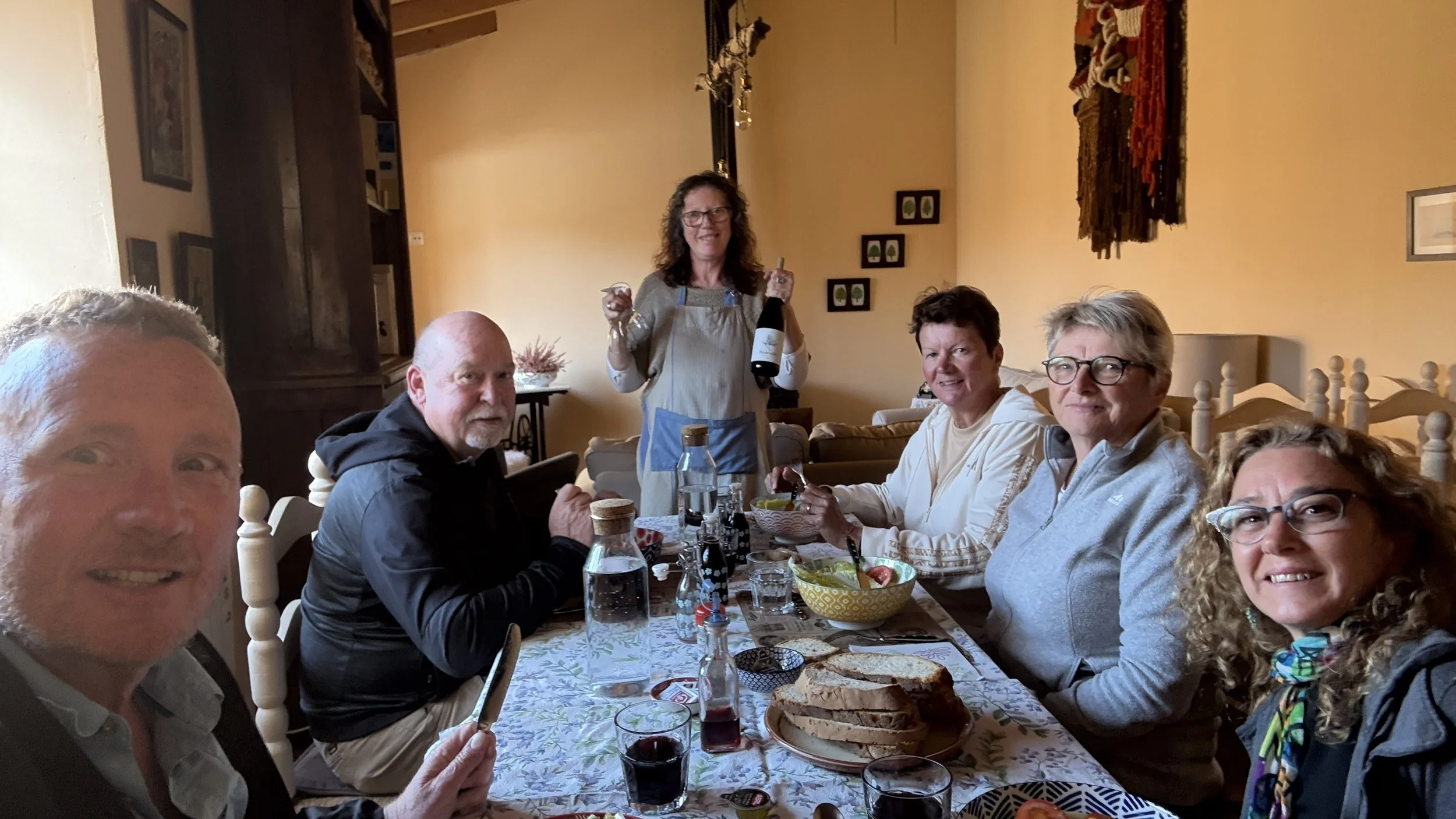 That night we stayed at L’Abilleiru Albergue Rural, a cozy, bohemian auberge with 10 pilgrims, a courtyard, and treehouse charm. For the first time this trip, we dined with the group. The host—an earthy woman with tangled gray hair and gold-rimmed glasses—ran every facet of the place. Dinner was Camino classic: salad, lentils with exactly four meatballs, ice cream tart, and local wine. We shared a table with three French pilgrims who spoke no English, but the conversation flowed as I understood a bit of the French and Christina translated between us for the rest.