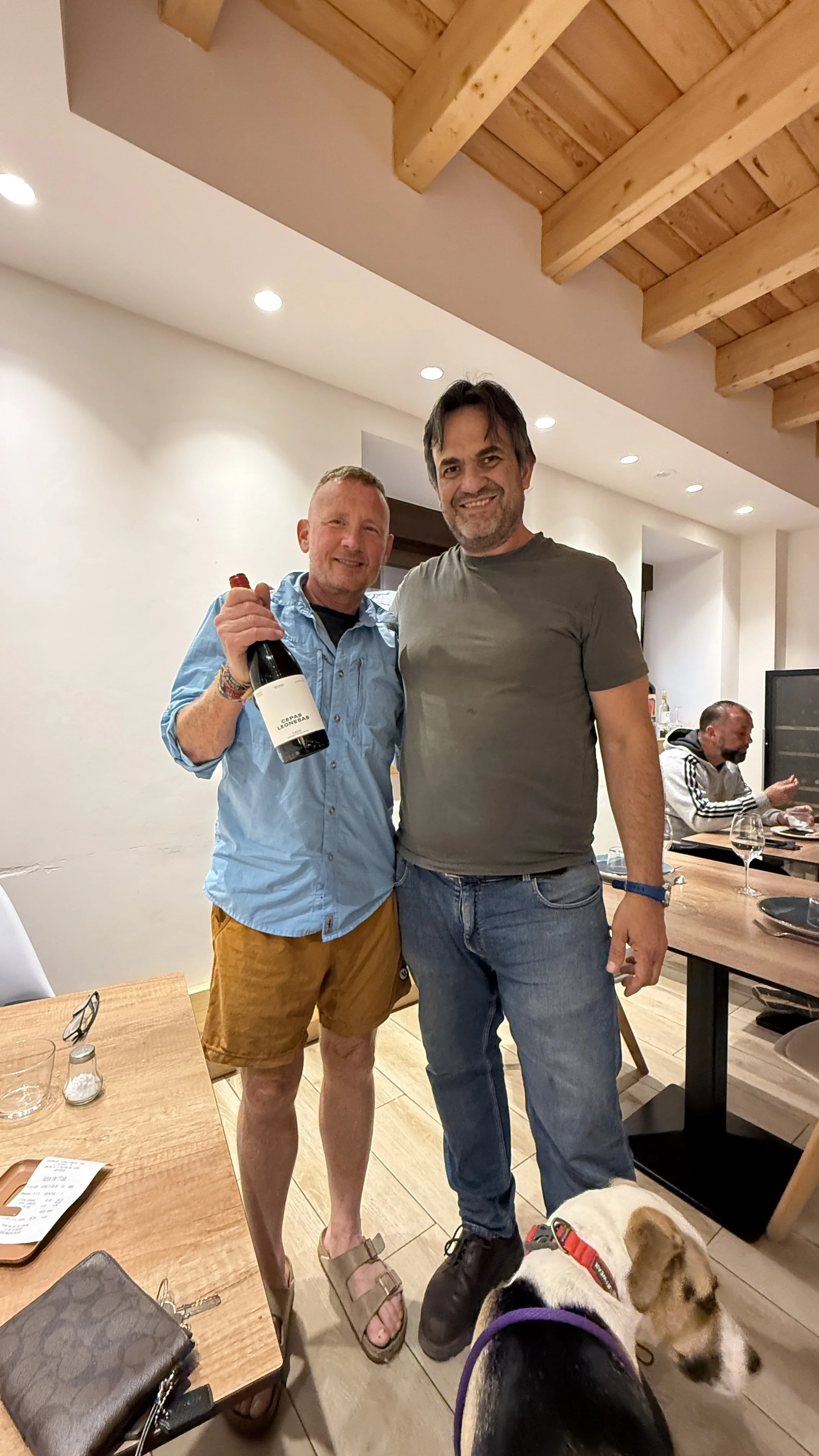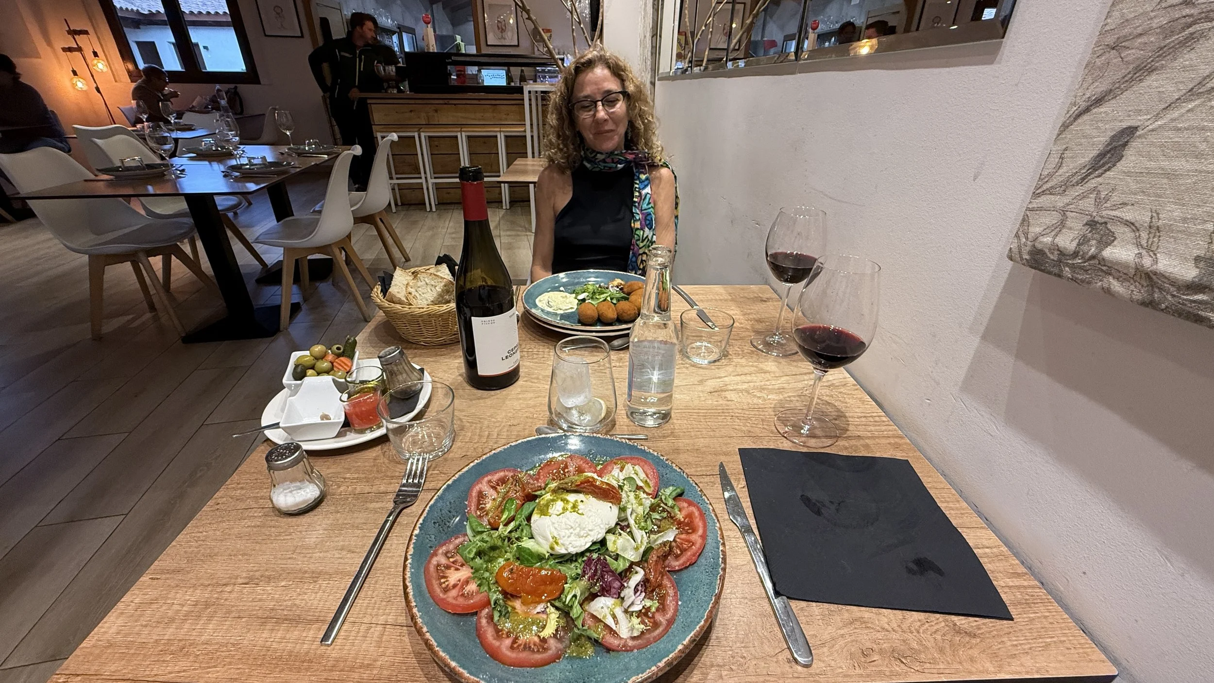 Dinner was exceptional. I had burrata with tomato, arugula, and pesto to start, followed by pork ribs and cheesecake. Christina chose shrimp croquettes and tuna but skipped dessert. We paired it all with Juan’s Cepas Leonesas, a tinto made from Prieto Picudo grapes. Intense aroma, red fruits like blackberry and blueberry, sweet entry, good structure, and a persistent finish. We both loved it.