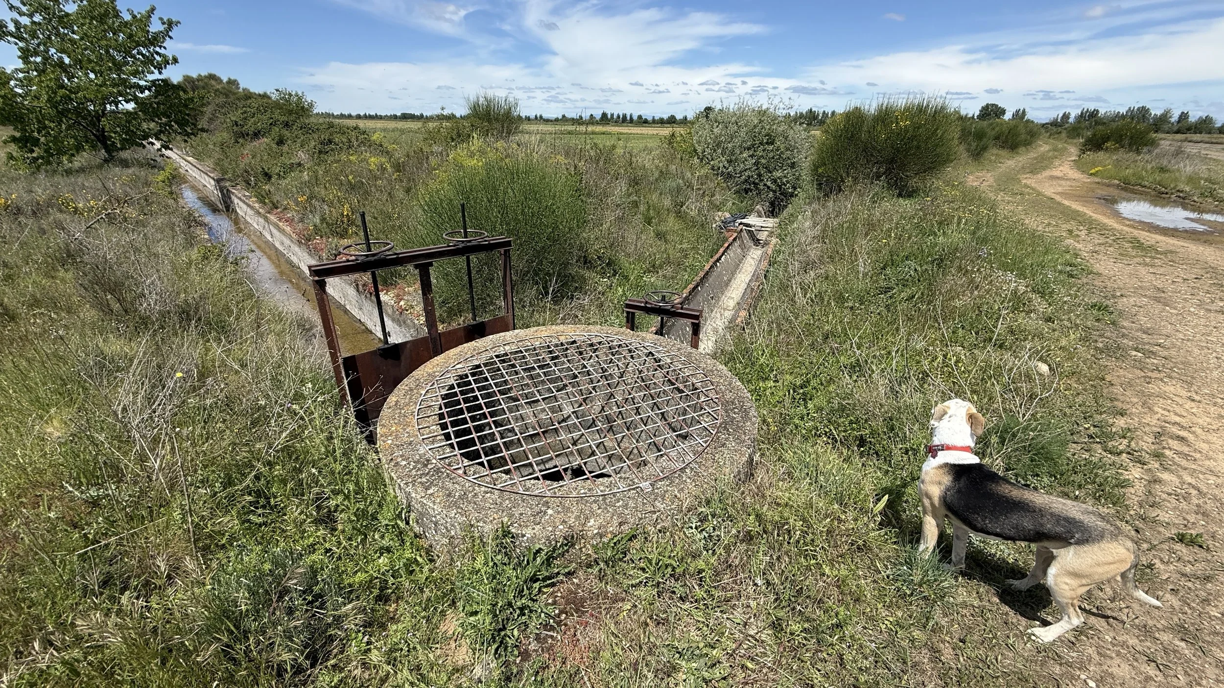 Back on the country roads, Google led us left again—into another field. This one was an overgrown path squeezed between the high-speed rail and a concrete irrigation channel. Endless crops stretched beyond. For 10 glorious km, Jax was off-leash, romping freely. It felt like Nebraska again.