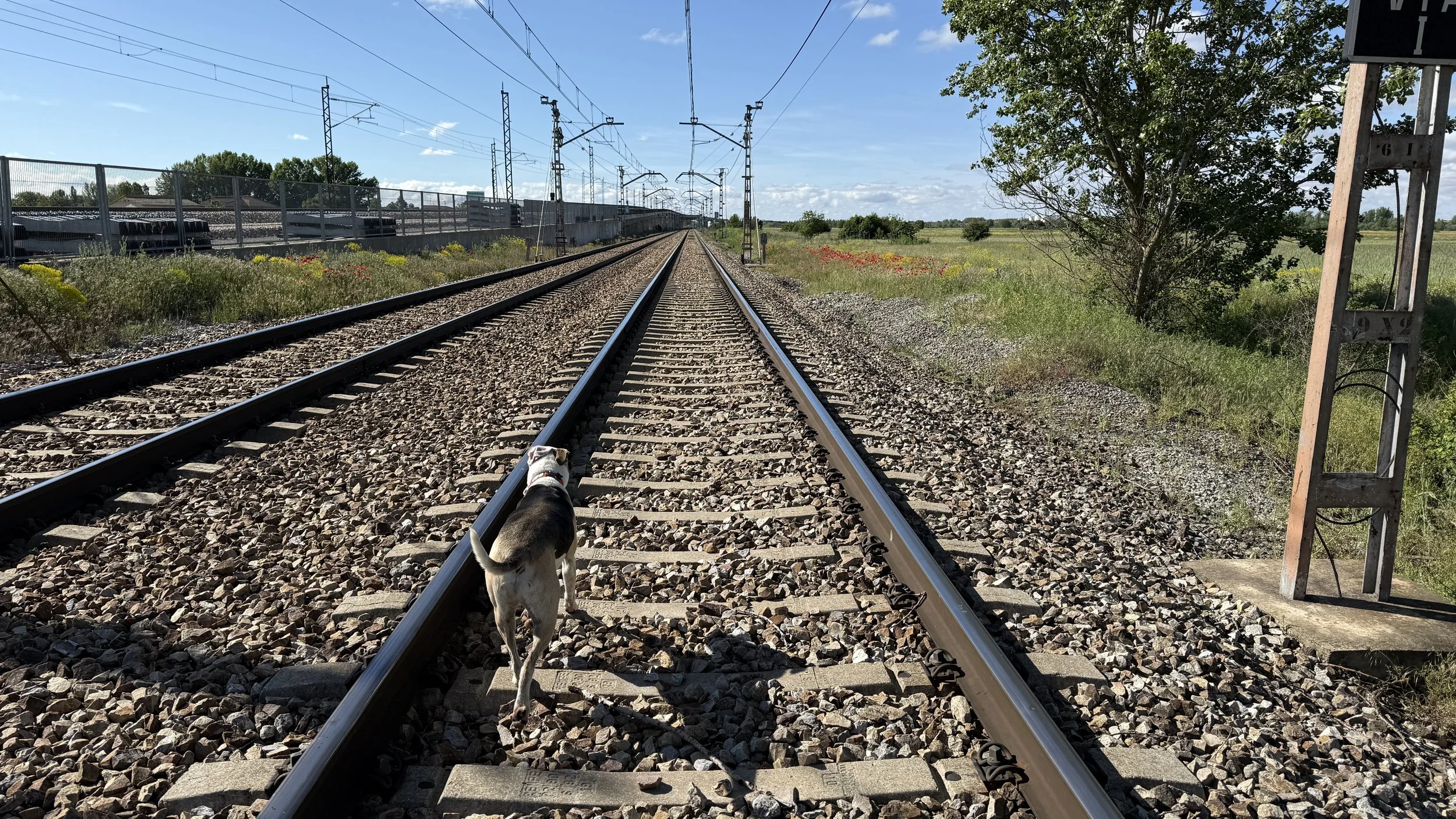 Another right turn and now we’re walking along and sometimes on a high-speed rail line. Jax was off-leash and loving it, but I was on edge, picturing a train roaring through at 150 mph. One more kilometer and we passed under a bridge—then, thankfully, a quiet country road appeared to our left.