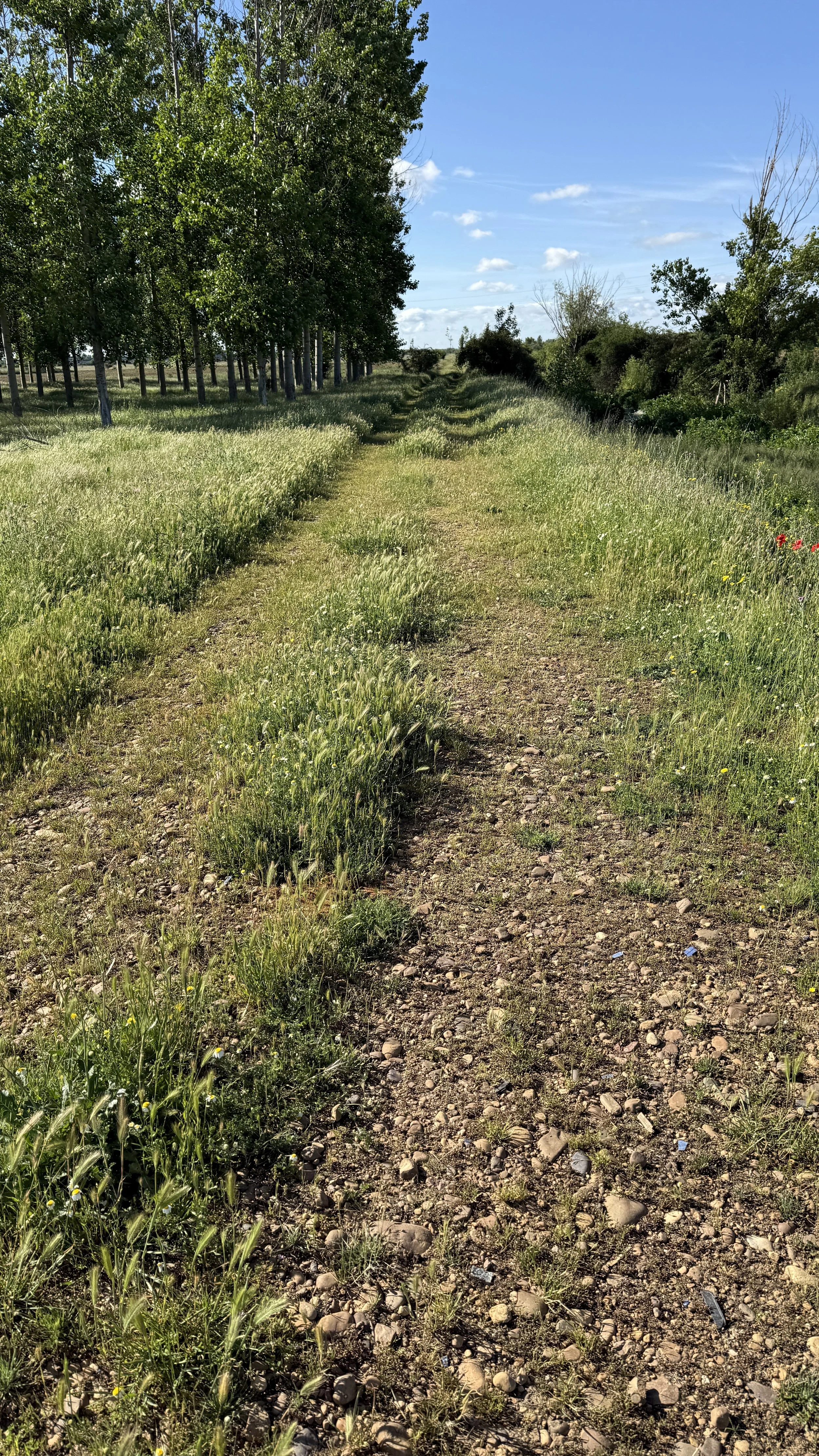 We started out on walking paths through small villages for about 10 km. Then Google Maps had me turn off onto a dirt road—just like the Camino. A kilometer later, it ended. On my left, a farm. Three large, territorial dogs charged toward us. Google showed the path continuing through a field. I stood my ground, faced the dogs, and kept calm while shielding a skittish Jax. Eventually, we moved on through wildflower fields until Google pointed left again—toward some ruts in overgrowth. I followed.