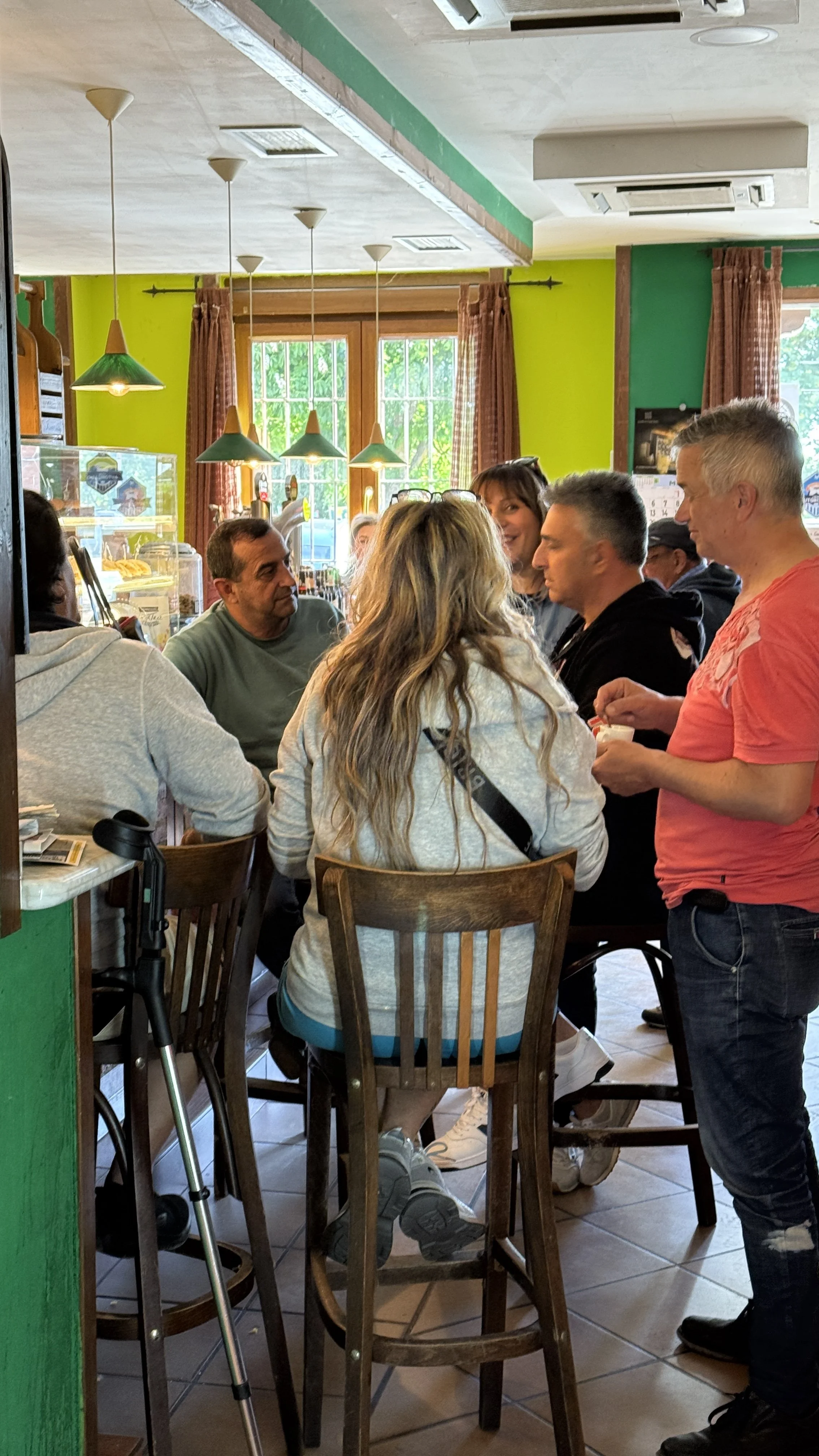 We rolled into Villa de Soto, where I spotted a quiet bar called Casa Jeremias. Unlike the busy Camino cafes, its outdoor tables were empty. After miles off-trail, I took the opportunity. Inside, it was packed—standing room only. Locals, retirees, workers on break. After being served over, a gentlemen motioned for the woman behind the bar to let me go. “Gracias!” I shouted. I finally ordered a café con leche and enjoyed it out in the sun with Jax.