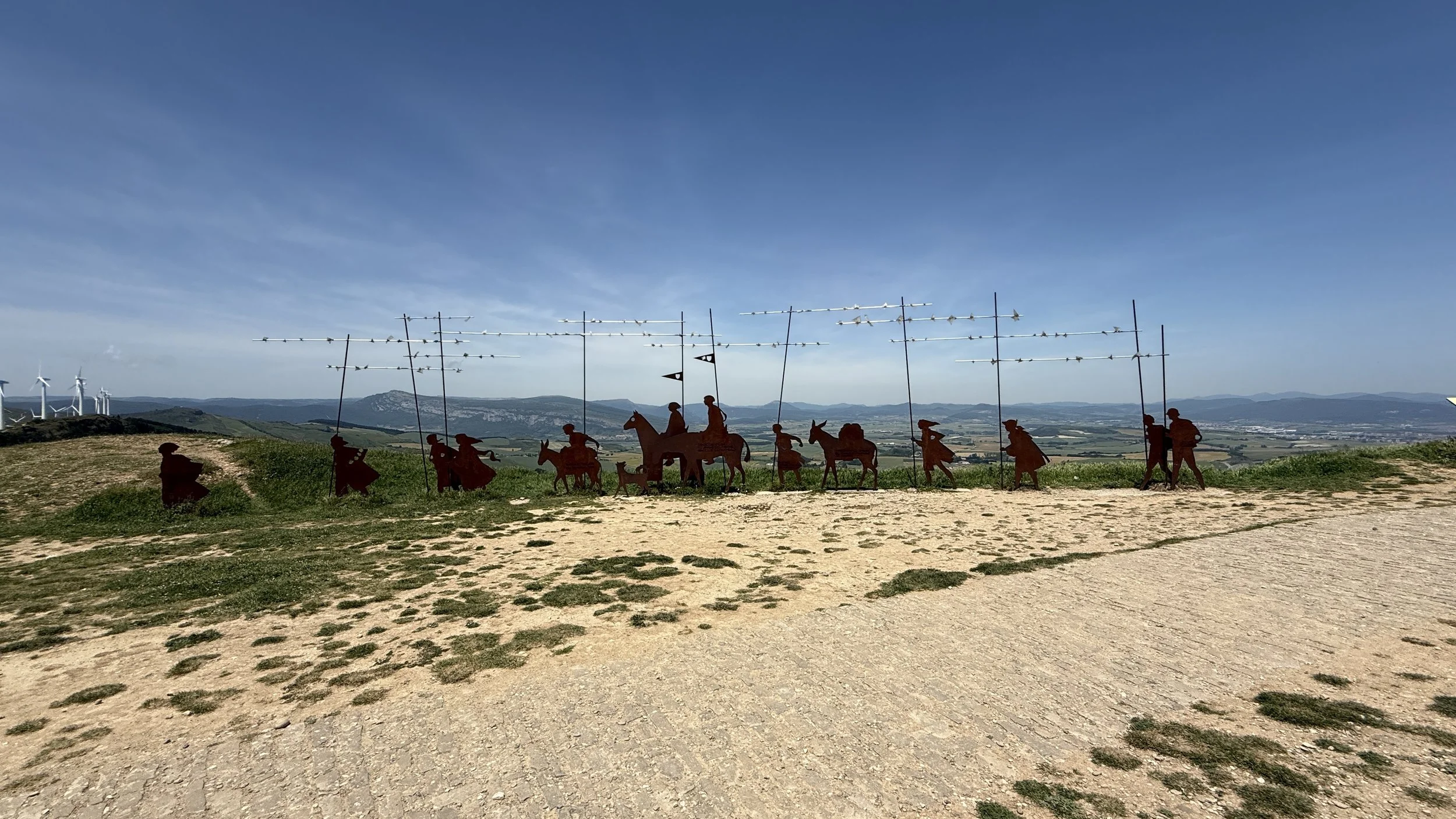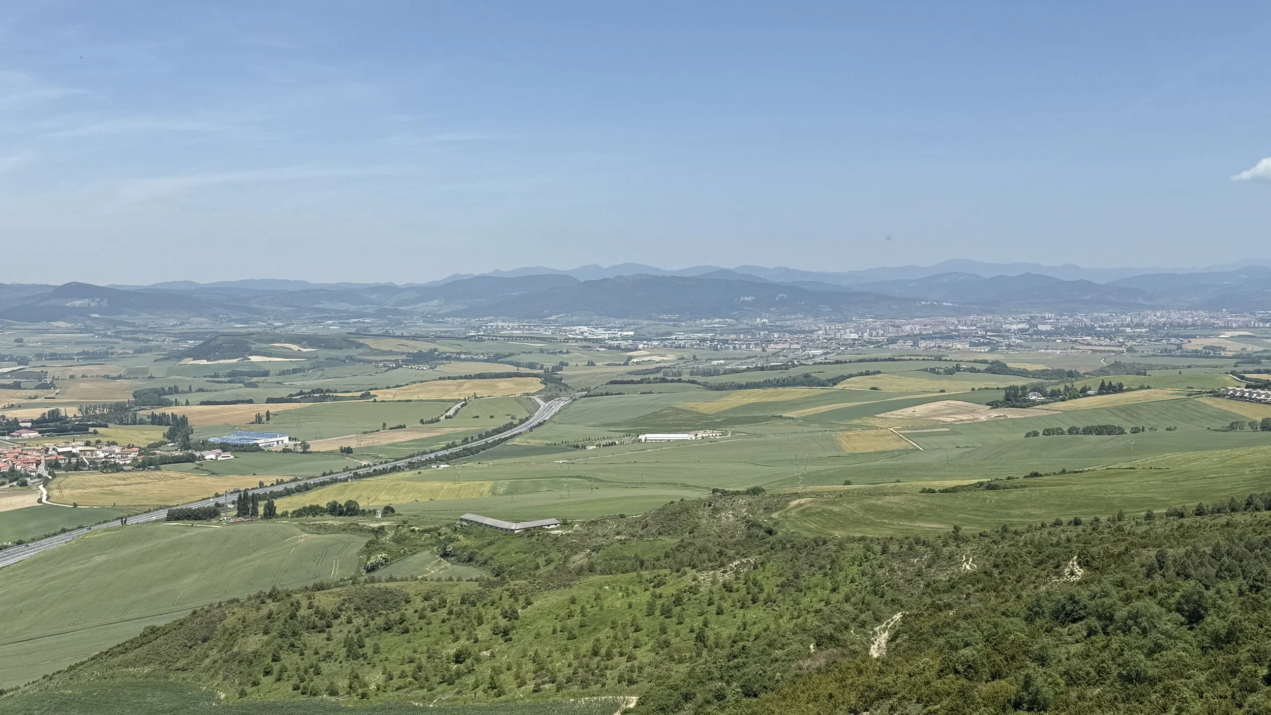 A few more towns and kilometers later, I started a 2k foot climb that took two hours—hot, rocky, and slow. Once I crested, I was greeted by a spine of wind turbines and a panorama: Pamplona ahead and Puente La Reina behind. The downhill was tricky; my shin can’t take too much impact, so I went slow and focused.