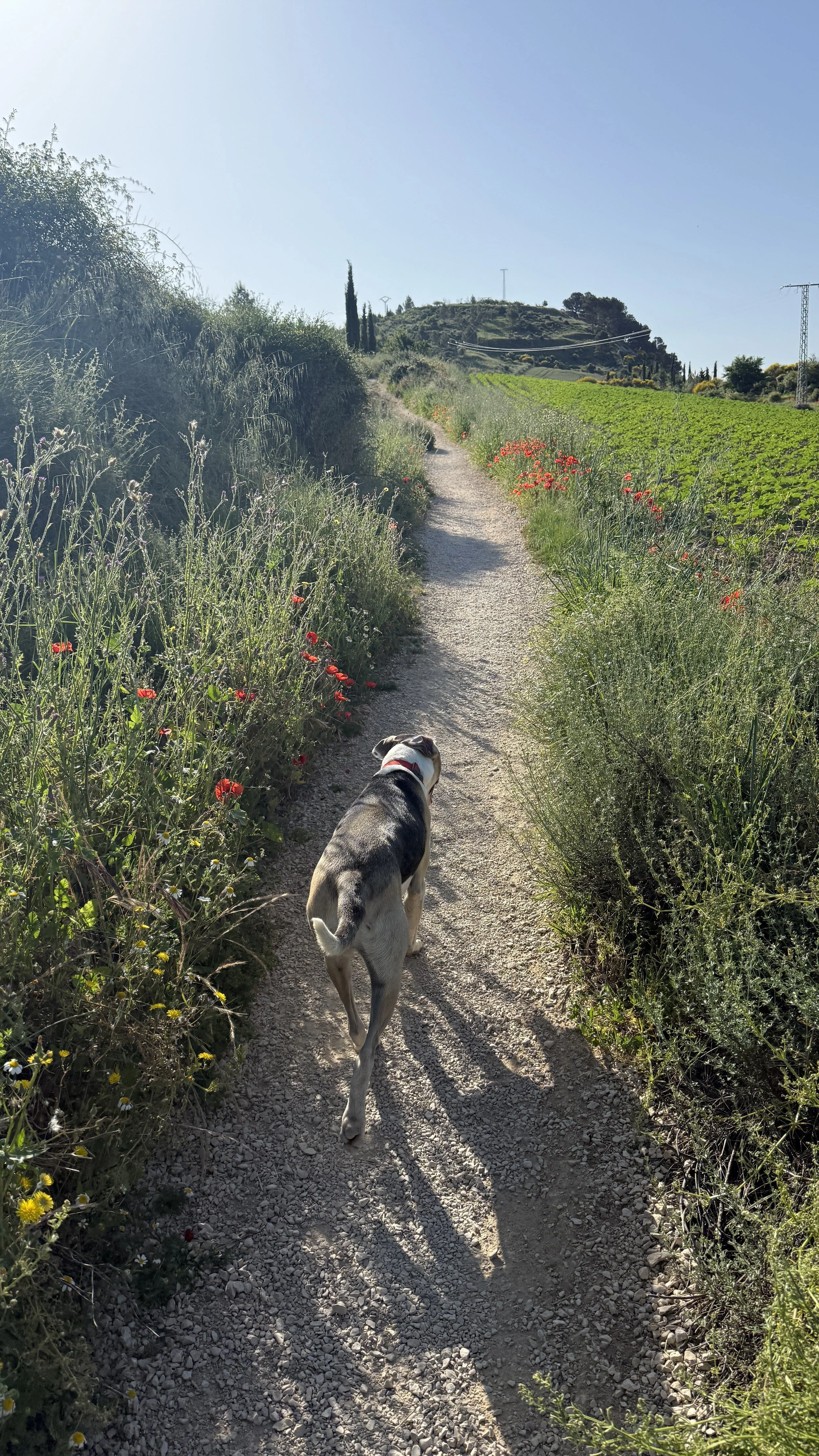 Today was again a scorcher. No breeze and little shade, and all the natural water sources from earlier weeks had dried up. Jax had no way to cool off. After 25km Jax and me approached Puente La Reina which means “Queen’s Bridge” for it was built by Queen Dona Mayor in the 11th scentry to aid pilgrims. I decided to pull Jax as he was dragging from the heat and the cat so I called Christina and she grabbed him outside of town. I could see he was happy to jump in his backseat and enjoy the a/c on his way to the hotel.