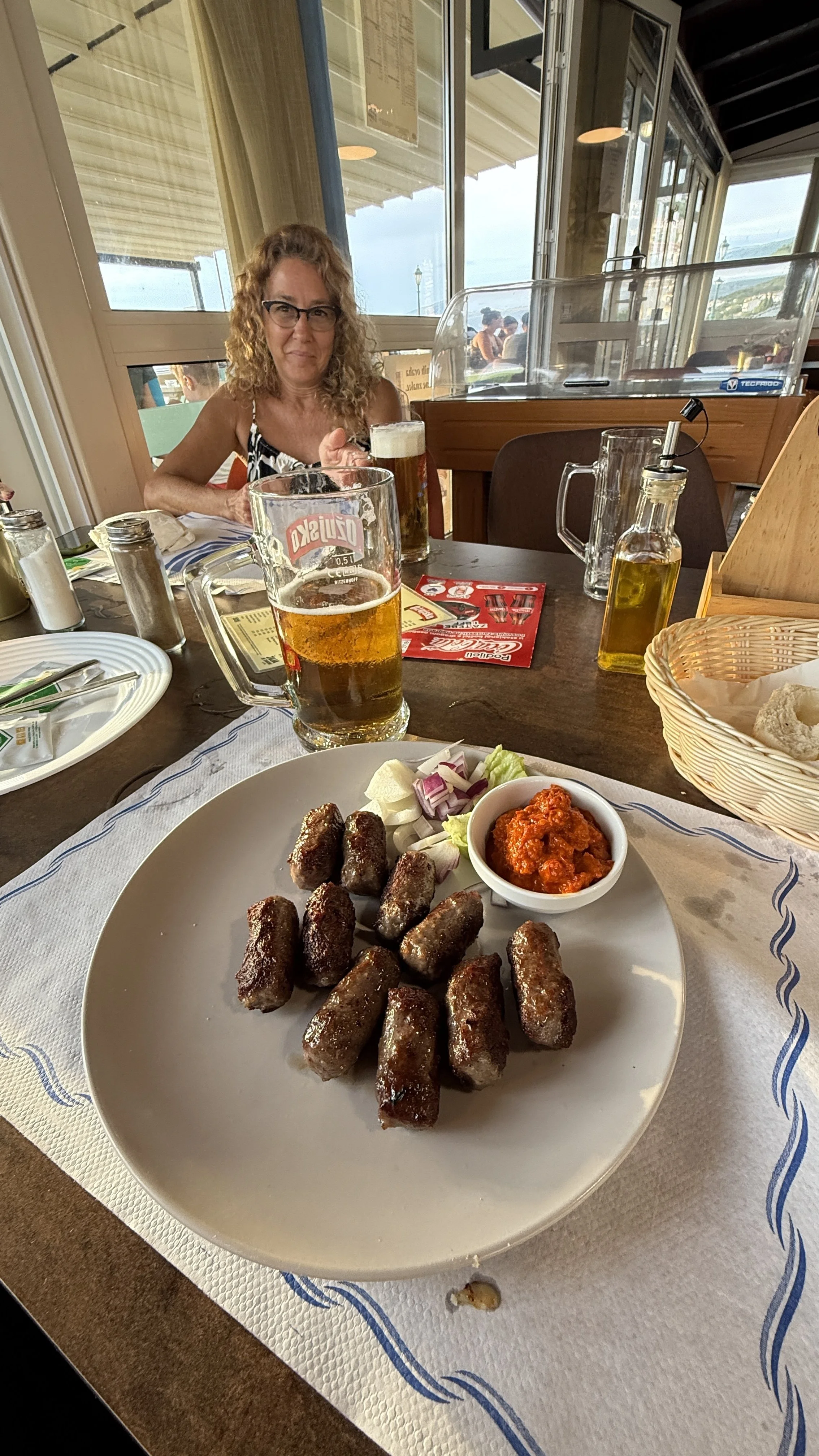 Dining customs here start earlier than in other European countries—usually around 6:00 or 6:30pm. I would’ve liked to eat even earlier, but with our late arrival and the usual post-run logistics, we finally sat down at 7:15. I love that wherever we go there are dogs at the tables—inside, outside, doesn’t matter. Jax has one habit I still haven’t broken: he thinks every dog is his best friend. Plenty of chances to work on that here.