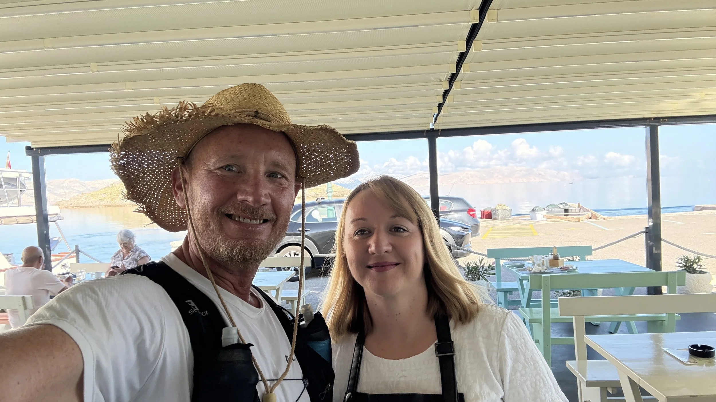 We wrapped early today at 3PM after a shortened distance to balance out yesterday’s long haul. Sveti Juraj is smaller and much less touristic than Crikvenica—which was fine by us. We walked the 40-meter seaside promenade that pretty much made up the entire village, scanning the half dozen restaurant options. We narrowed it down to the top three (all rated around 4.4) and went with the crowd—Bistro Riva, right on the pier looking out at the island in the harbor.