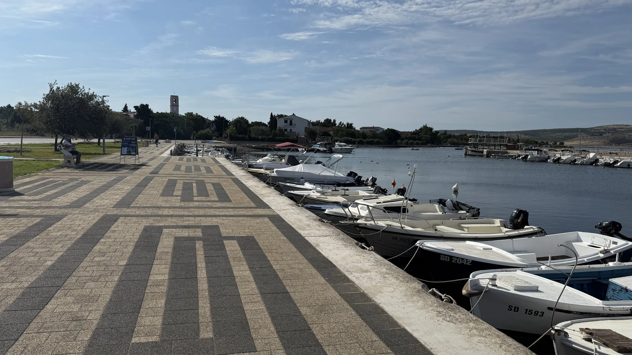 Down from the bridge, I ran into Posedarje, a small town near the Novigrad Sea. I dipped into a market to resupply while Christina was trying to solve another logistics puzzle—tonight’s lodging. Nothing nearby. Eventually we found a spot, but it would cost us an hour of extra driving and no breakfast. Not ideal. But we’ve done it before and we’ll do it again.