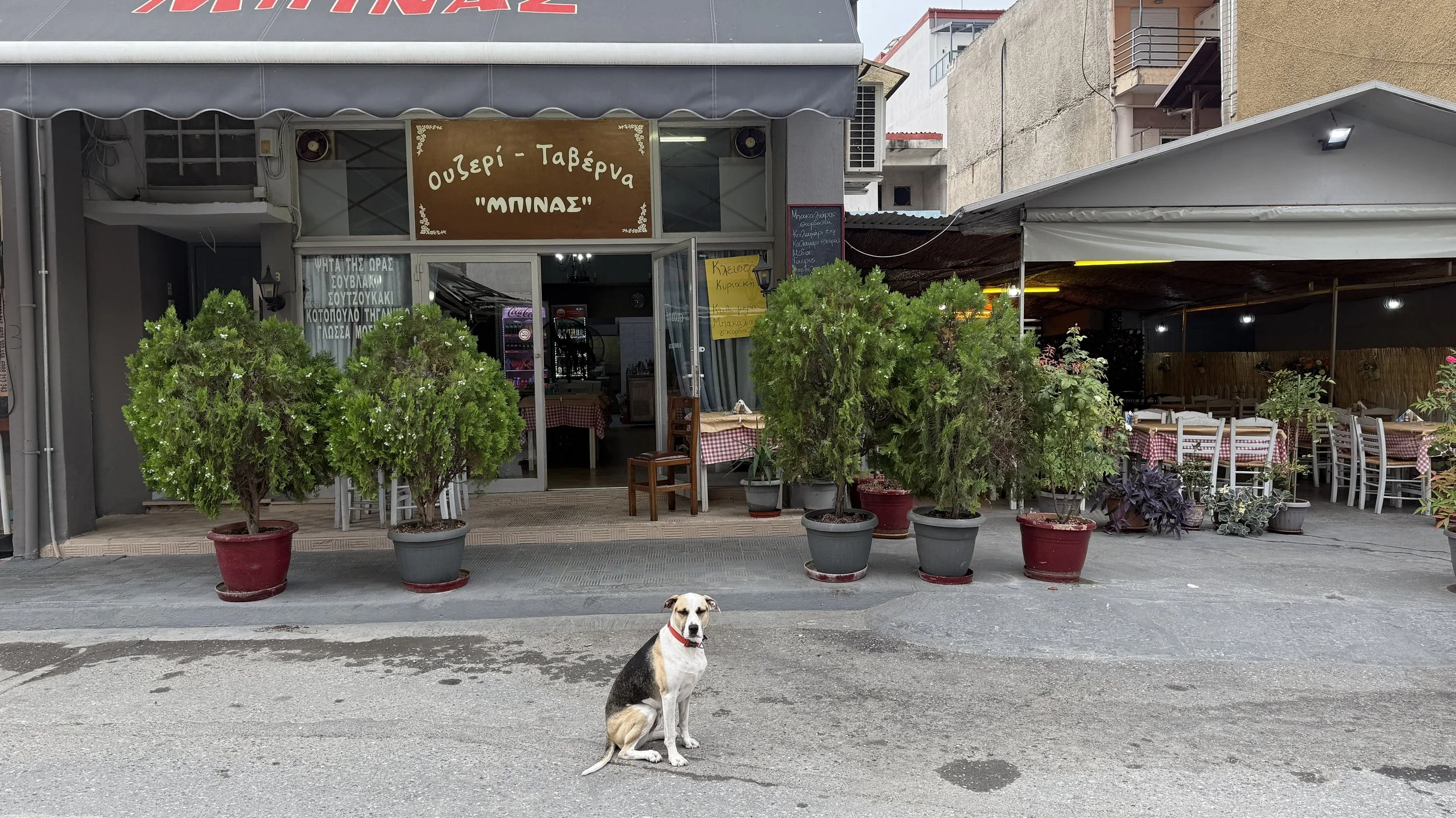 Back on the shoulder of the E86, the next town I passed through was Chalkidona. Around noon, the scent of grilled meat hit me hard. A gyro sounded tempting, but the heat made me think better of it. I grabbed my usual: baguette, feta, cucumber, olives, tomato, olive oil.