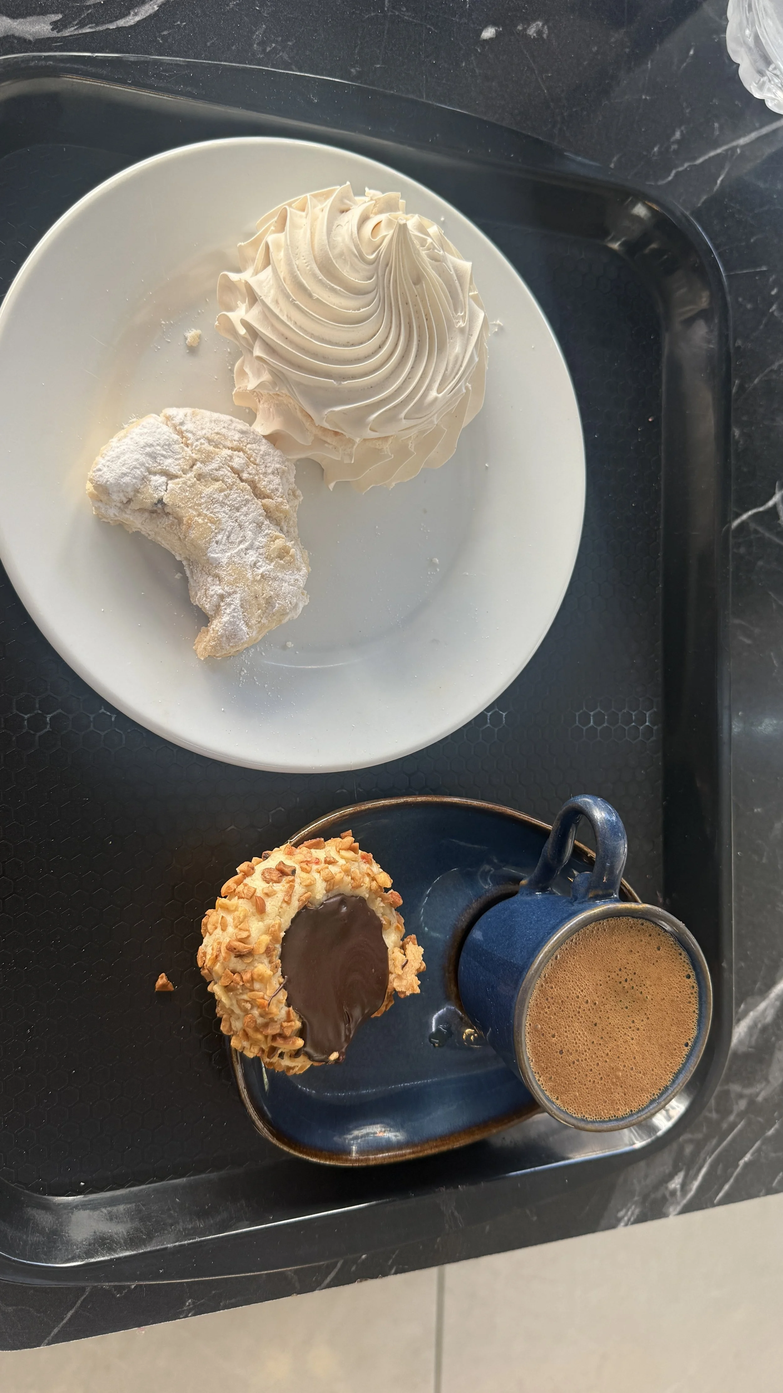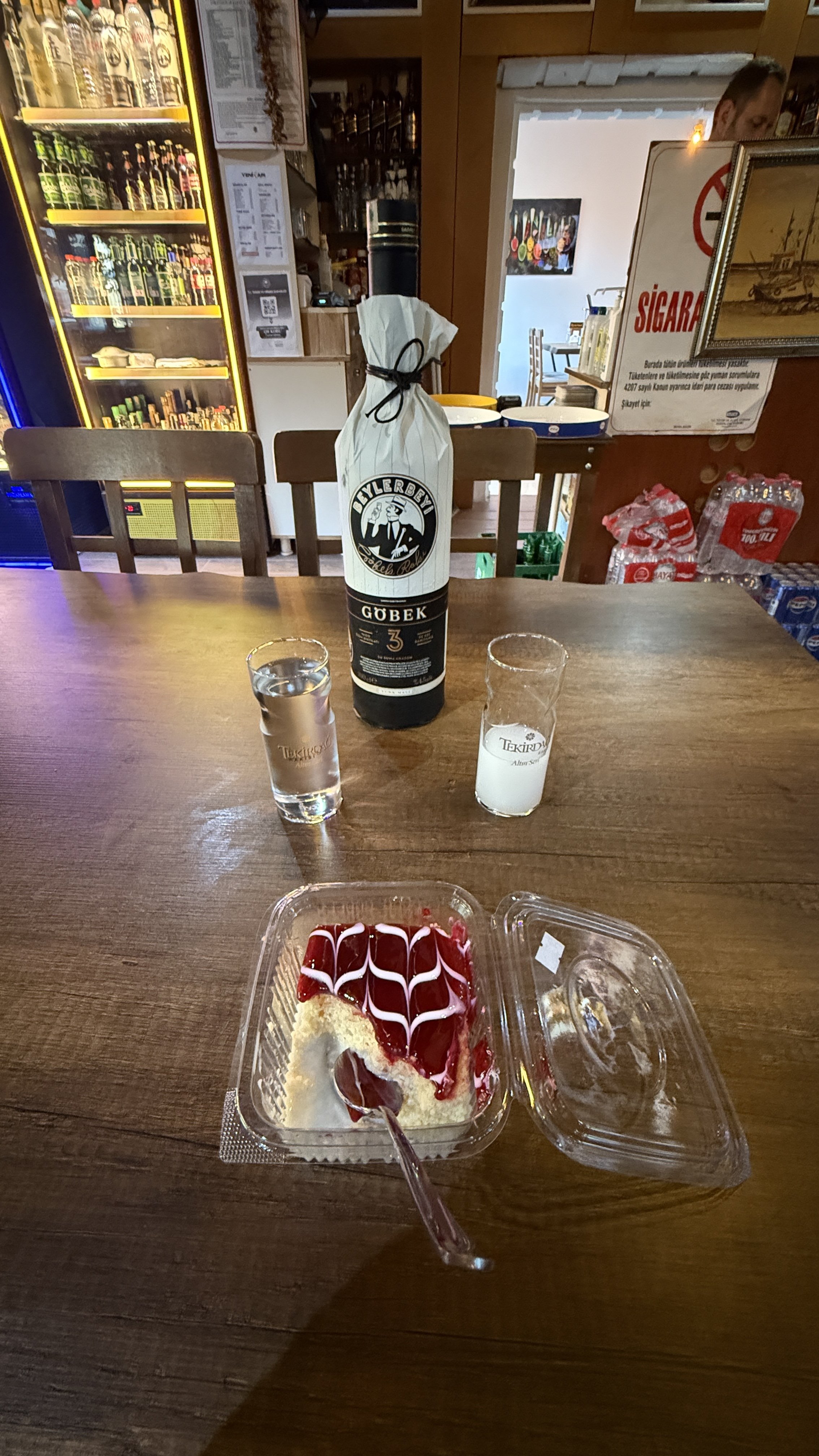 Afterwards, I translated “dessert” on my phone. Dad disappeared, ran down to the pastry shop, and returned with cake, which he served with a Turkish liquor. There was ceremony to it—two clean glasses held to the light, the clear spirit measured precisely, topped with mineral water until it clouded, the second glass just mineral water. It was like a chemistry lab, the taste somewhere between anisette and Pepto-Bismol, softened by the dilution. The whole experience was warm, generous, and I left full and happy.